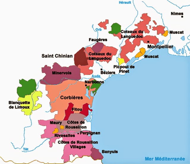Die Rebflächen liegen meist nah an der Küstenlinie auf einer Länge von nahezu 240 km. Das Klima ist im Sommer trocken und heiß. Die Niederschläge kommen meist in Form heftiger Schauer nieder, so dass Trockenheit zwischen den Monaten Mai und September eines der größten Probleme für den Weinbau darstellt. In einigen Gebieten des Languedoc ist der Weinbau sowie der Anbau von Oliven die einzige mögliche Nutzung der landwirtschaftlichen Flächen. Andere Nutzungen würden eine großflächige Bewässerung erfordern.